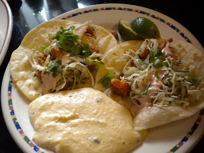 For lunch I was able to try both the special salmon taco - delicious with a tasty sauce - and the fried shrimp taco, which was also very good. The jalepeno cheddar cheese grits souffle was awesome and should not be missed. Many of the other side options look like great choices as well, especially the cactus salad which I didn't yet try. Service was friendly and fairly quick and our waiter steered us in the right direction with several recommendations. I look forward to returning to Krazy Fish to try more menu items - in particular the wings and the shrimp and grits. Also to note: every day tacos are half price from 4-6 PM - a great deal - and on Tuesdays bottles of wine are half-price as well.